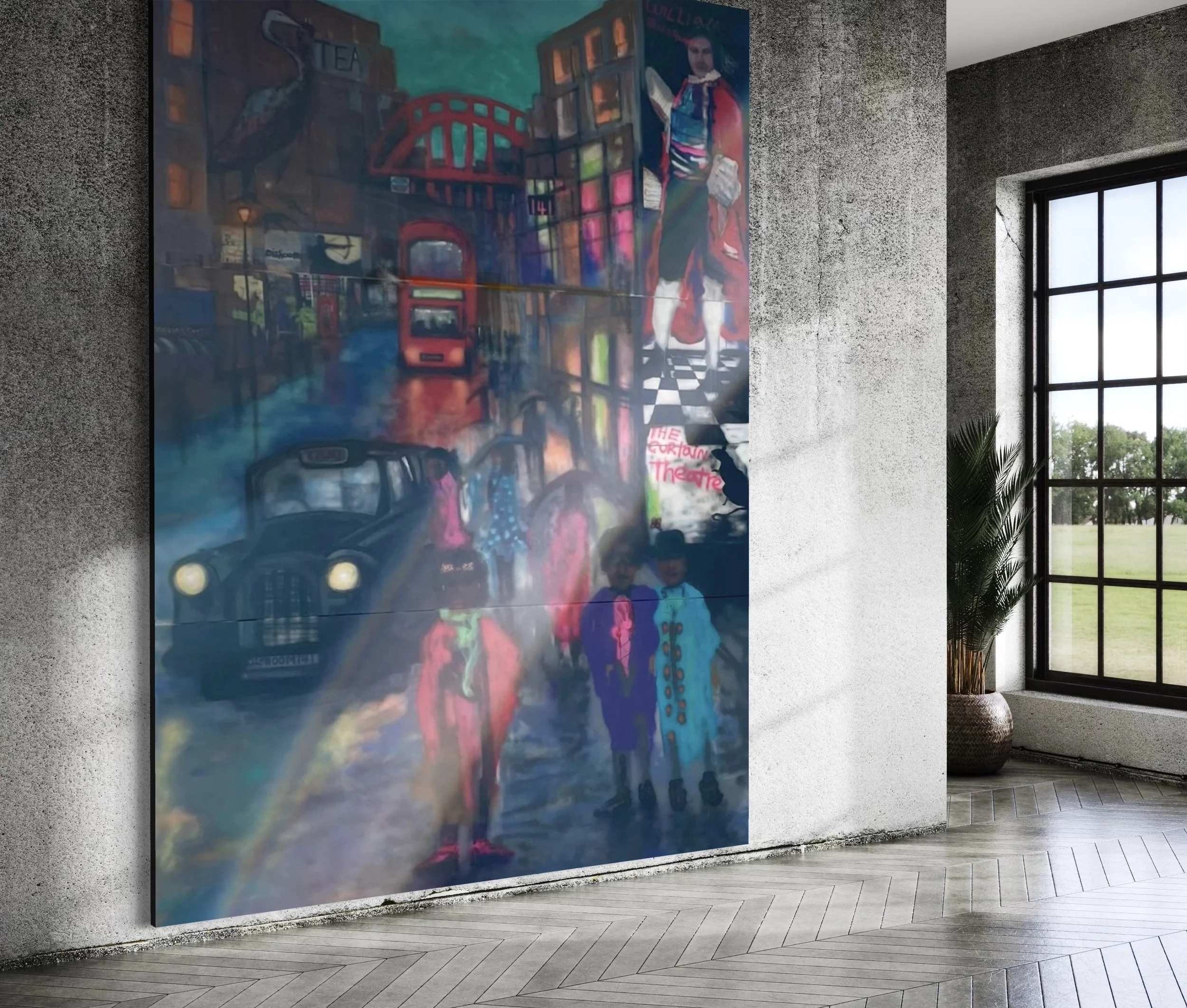 Being commissioned by Dishoom was a significant milestone in my career as an artist. The painting is permanently installed in Shoreditch, London, and measures 4.5 metres high by 3 metres wide.